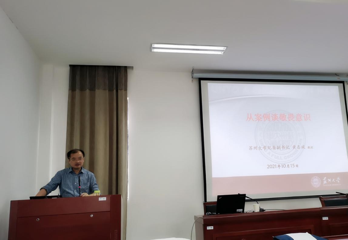 校纪委副书记黄志斌以《从案例谈敬畏意识》为题,从“以案为鉴,说德说纪说法说责”“守纪律讲规矩,知敬畏明底线”“加强对‘一把手’和领导班子的监督”等三个方面开展专题培训,深入解读阐释有关法律法规、党规党纪要求,并结合有关影视资料以及案例进行了警示教育。