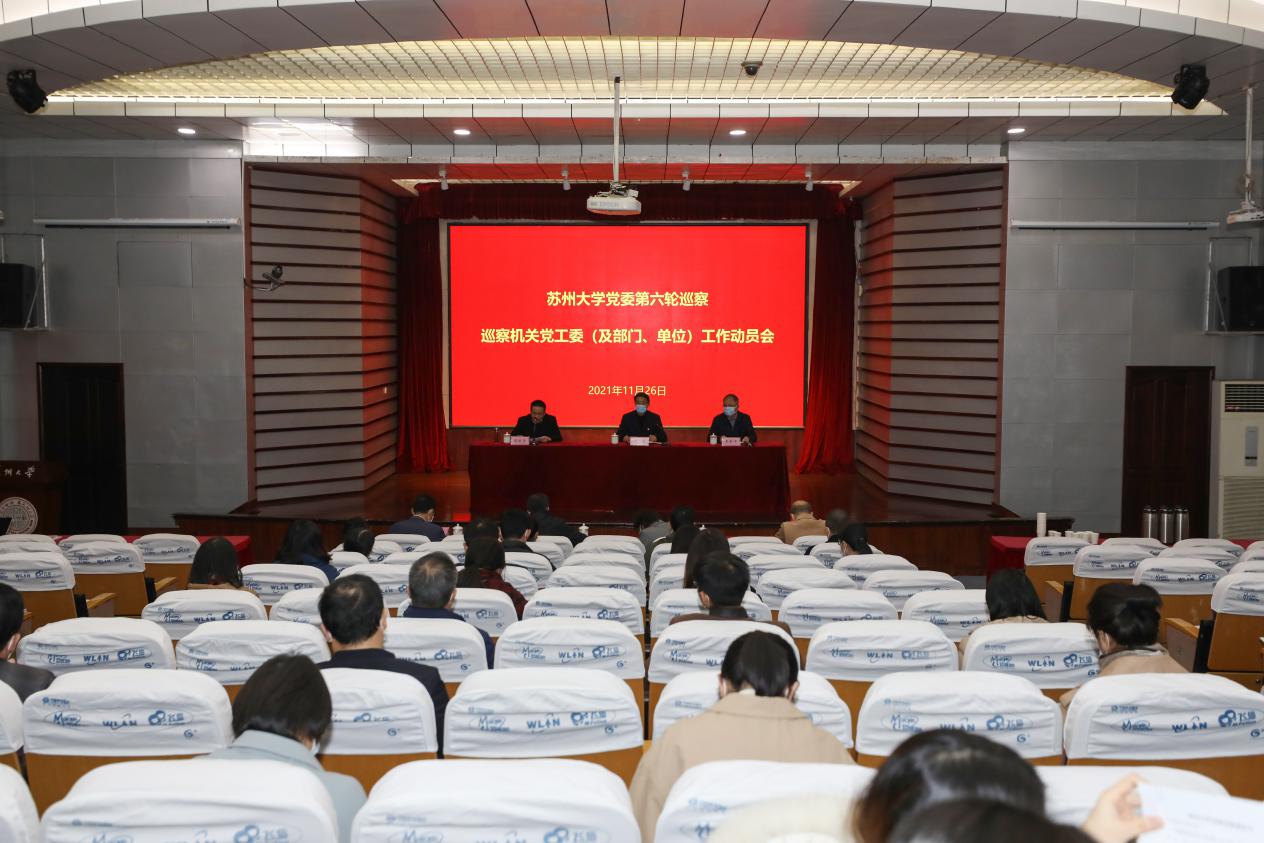 根据苏州大学十二届党委第六轮巡察工作的统一部署安排,11月26日下午,校党委第六轮巡察第一、第二巡察组巡察机关党工委(及部门、单位)工作动员会在本部学术报告厅召开。第一巡察组组长、校党委副书记王鲁沛,第二巡察组组长、校党委副书记邓敏,巡察组副组长赵阳、刘枫、刘鲁庆、张才君,巡察组联络员姚永明、薛曦、杨菁、蒋峰及全体成员出席动员大会。机关党工委各党支部书记、各部门单位主要负责人、综合科科长参加会议。动员大会由机关党工委书记、党委组织部副部长张振宇主持。