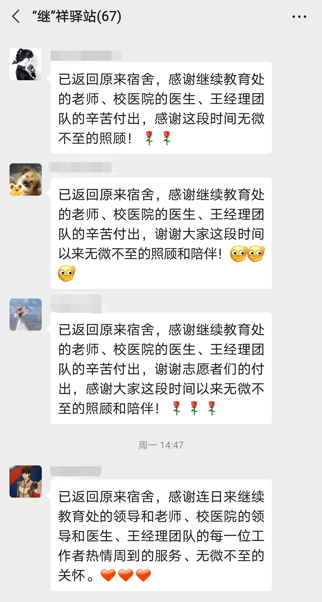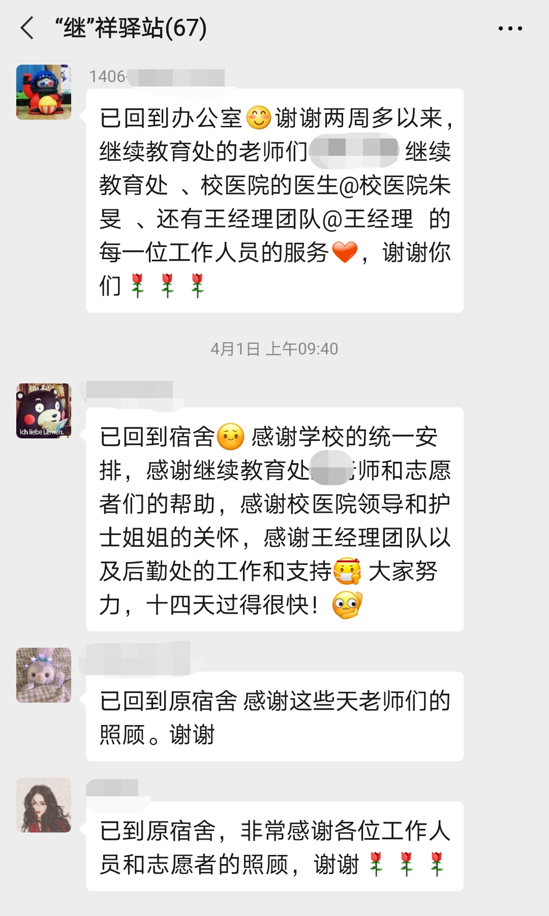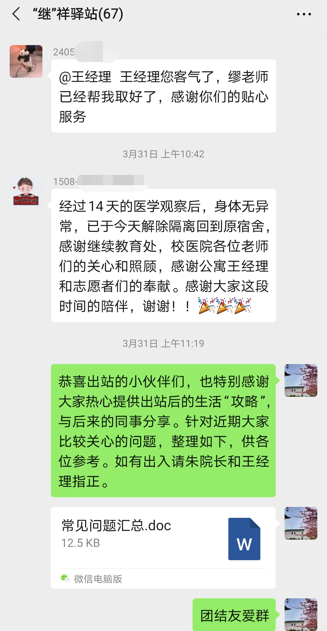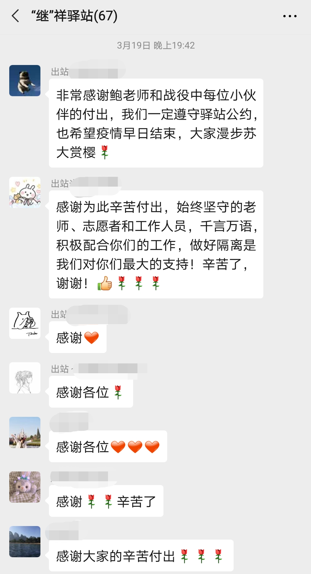 3月9日学校发布《关于做好教职员工返苏待岗工作的通知》,明确“居住在校内教工集体宿舍的教职工须在校内集中隔离观察14天”。考虑校内公寓服务团队人手紧张且前期连续作战,为了给返校教工提供好隔离观察期间的生活保障服务,当晚支部书记陆惠星在党员中发起志愿服务倡议书,半小时内即有22名同志主动报名。3月15,在经过校防控办安全与防护培训以后,服务队正式接手,缪世林处长带领第一队队员入住公寓,开始为期一周的服务。近一个月来,缪世林、孙掌印、张卫、李洪勋、王建凯、陈耀、王健、姜黎明8名党员接续传递,已先后服务入住校内隔离观察点的64名师生。用真心陪伴师生返校旅途的最后“一”站,用行动为返校师生打造温馨“驿”站。入住师生们的默契配合和温馨“互动”,出站后的信息分享和互帮互助,让“驿站”成了遇见理解和传播善意的能量站。
