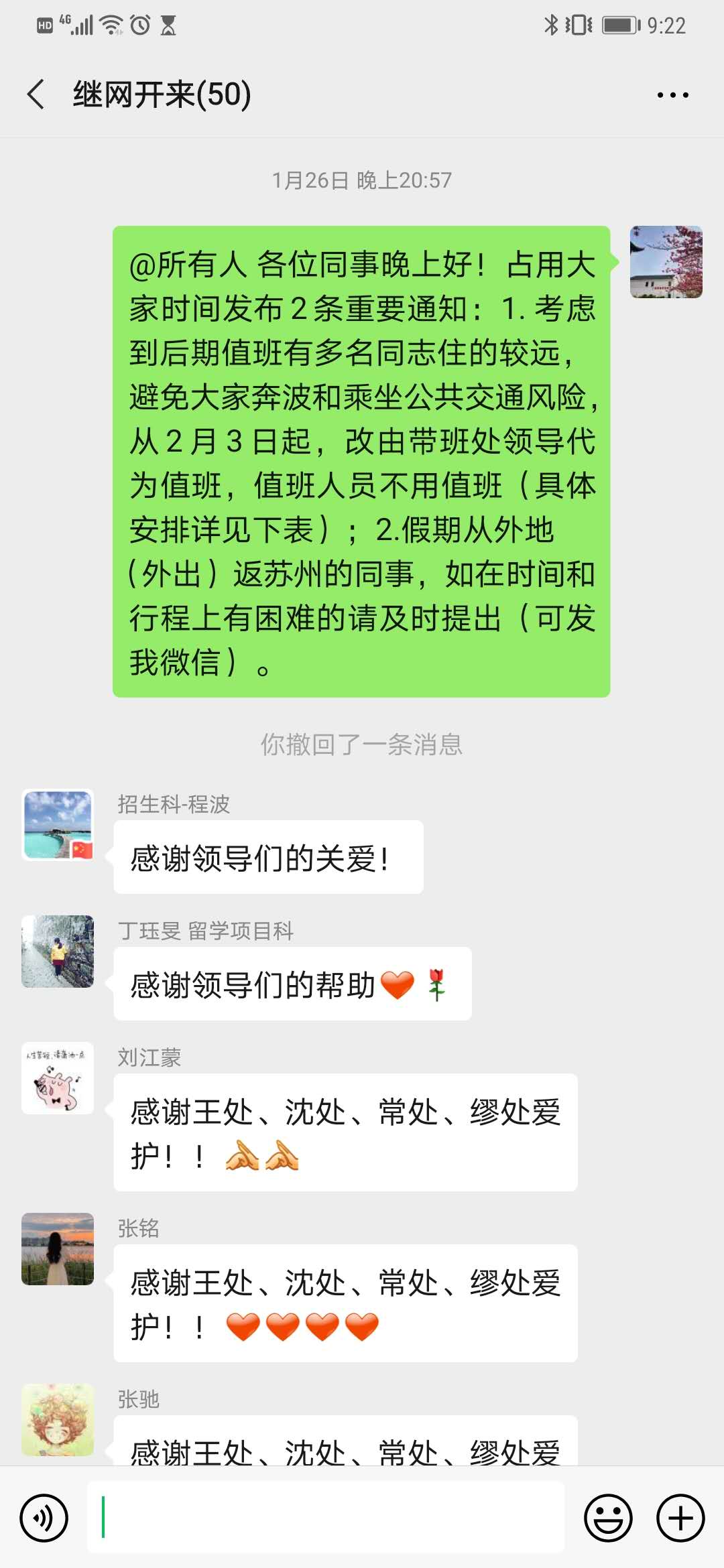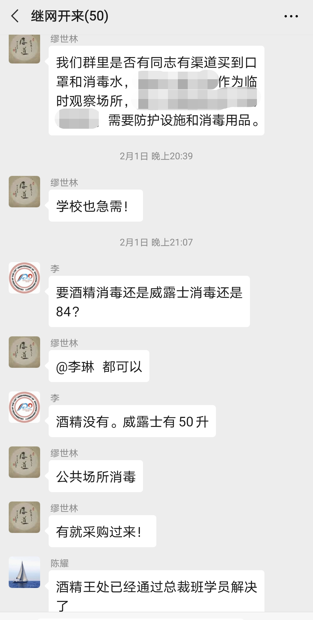 疫情突然,为了帮助学校筹集防疫紧缺物资,2月1日,缪世林处长在工作群中紧急动员教职工充分挖掘身边信息,征集口罩、消毒水等防控物资的购买渠道。