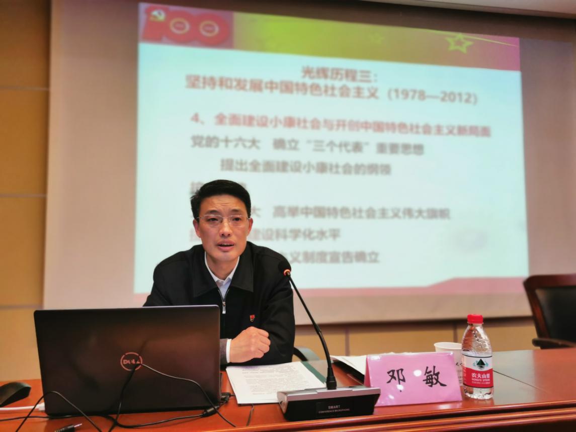 邓敏围绕学习领会习近平总书记在党史学习教育动员大会上的重要讲话精神,用“重大决策、正当其时、必然要求、一件大事”四个关键词深入浅出地阐述了开展党史学习教育的重要性。围绕建党的开天辟地、新中国成立的改天换地、改革开放的翻天覆地、党的十八大以来以来的经天纬地四个重要历史时期,结合革命故事与大家一起回顾了中国共产党实现民族独立和人民解放、建立社会主义制和推进社会主义建设、坚持和发展中国特色社会主义及中国特色社会主义进入新时代的百年光辉历程。
