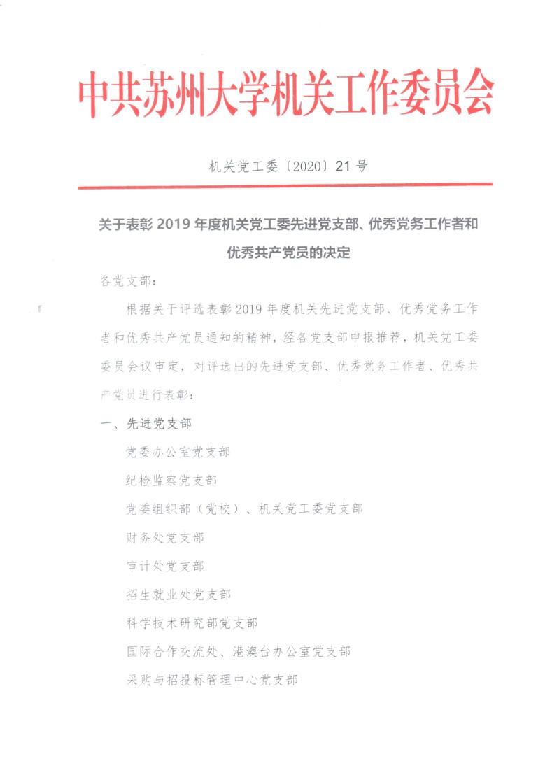 关于表彰2019年度机关党工委先进党支部、优秀党务工作者和优秀共产党员的决定