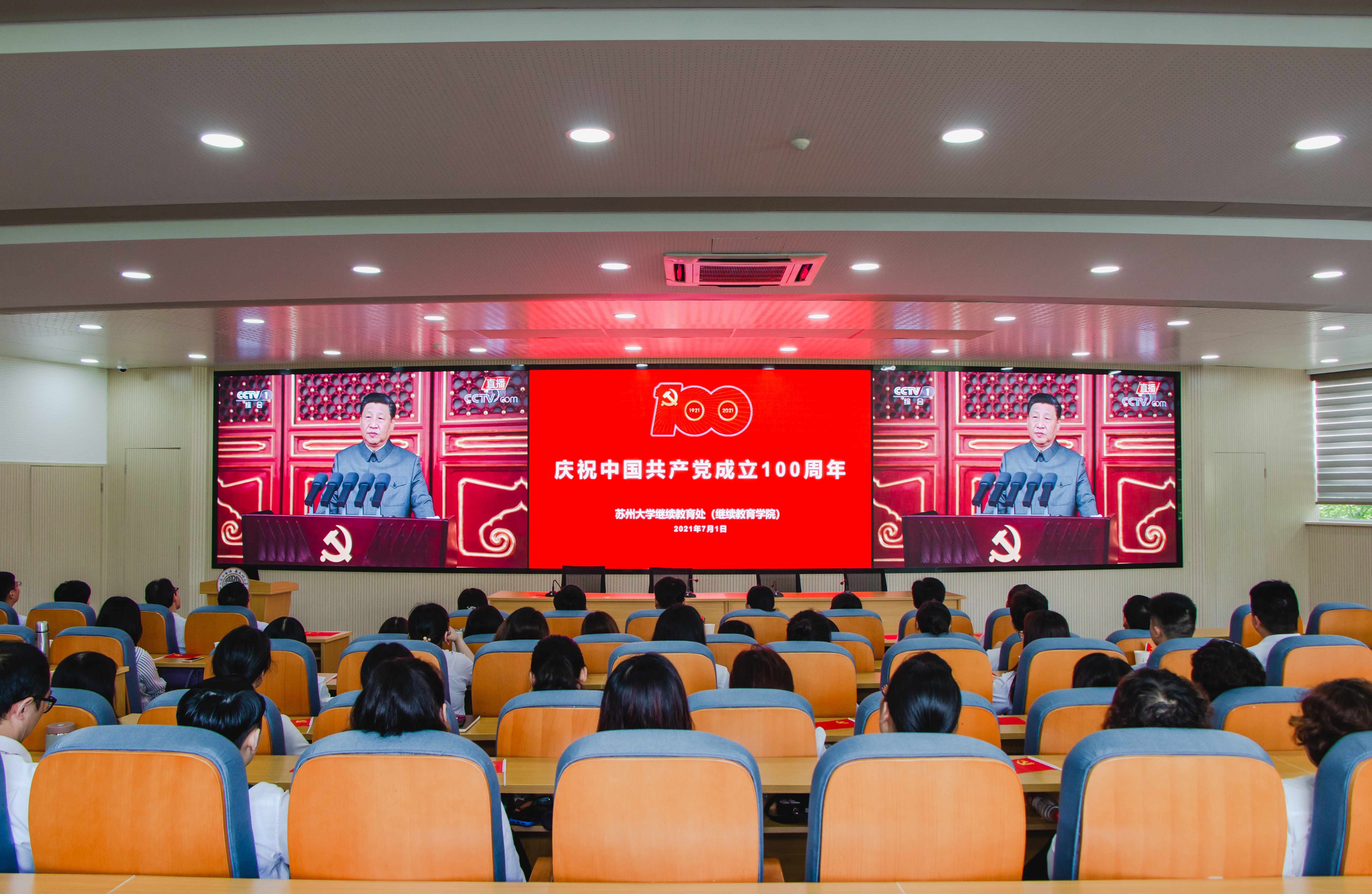 7月1日上午,庆祝中国共产党成立100周年大会在北京天安门广场隆重举行。苏州大学继续教育处(继续教育学院)组织全体教职工在北校区工科楼大报告厅集中收看大会盛况,聆听习近平总书记重要讲话,共庆中国共产党百年华诞。
